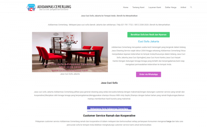 cucisofajakarta.com adalah website untuk layanan cuci sofa. Menurut website tersebut, cuci sofa dikerjakan di rumah konsumen. Selain cuci sofa, mereka menyediakan layanan jasa cuci jok mobil. Adidanmas Cemerlang adalah pemilik dari cucisofajakarta.com yang menyedakan jasa cuci sofa, jasa cuci springbed, jasa cuci kursi kantor, jasa cuci karpet kantor, jasa cuci jok mobil, jasa cuci jok kereta, dan jasa cuci jok pesawat. Websitenya menonjolkan berisi beranda, Company profil, layanan mereka, daftar harga jasa mereka, dan artikel tentang jasa cuci sofa. Sosial media yang Mereka pajang di website diantaranya sosial media Facebook, Twitter, dan Instagram.