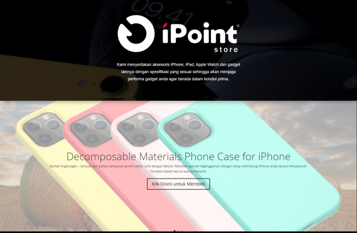 ipointstore.id adalah website yang menyediakan aksesoris lengkap khusus iPhone, iPad, Apple Watch. Website ini dilengkapi slide di bagian tengah halaman produk yang menampilkan produk smartphone iPhone. ipointstore.id berisi tentang list produk, cara service, tentang ipointstore.id, kontak mereka, dan kebijakan privasi. Di halaman cara service juga disediakan maps untuk berkunjung ke iPointStore Bandung. Mereka menyediakan whatsapp untuk komunikasi.