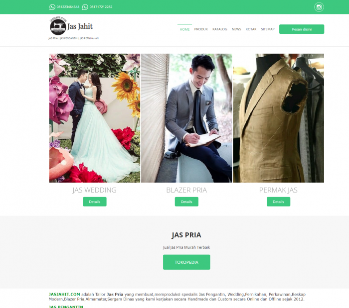 jasjahit.com adalah website yang menyediakan jasa penjahitan jas pria. Jas dibuat dan dikerjakan secara handmade. Website ini berisi produk, katalog, berita, dan order jas. Juga ada whatsapp untuk langsung menghubungi mereka. Pada halaman pesan, pilihan yang disedakan diantaranya jas pria, celana, rompi jas, dan kemeja. Banyak gaya dan warna yang disediakan pada halaman pesan, ada beberapa pilihan warna. Mereka juga memajang bahan kain yang bisa konsumen pilih di website mereka.
