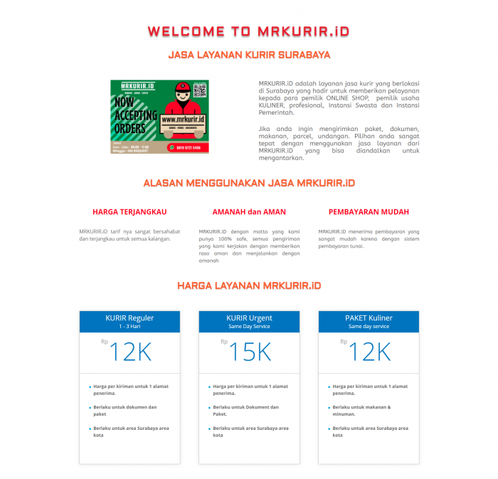 MrKurir.id adalah website jasa layanan kurir untuk wilayah Surabya. Jasa yang ditawarkan diantaranya pengiriman paket untuk online shop, usaha kuliner, dan dokumen. Website ini berisi penjelasan tentang MrKurir.id, harga pengiriman, form yang wajib diisi jika ingin order jasa pengiriman. Selain itu, ada whatsapp yang disediakan untuk dihubungi. Websitenya ringkas dan jelas walaupun hanya ada satu halaman.