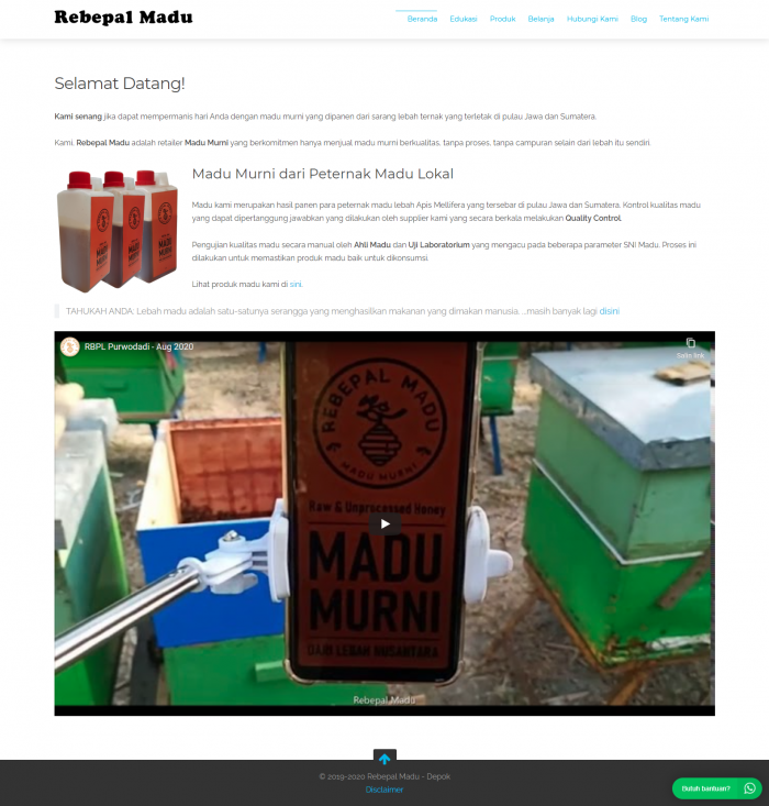 rebepalmadu.com adalah website yang menawarkan produk manis yaitu Madu alami dan murni. Website Rebepal Madu berisi Beranda, Edukasi, Belanja, Hubungi, Contact, Blog, dan halaman tentang Rebepal Madu. Lebih lengkapnya lagi, website ini adalah website yang memasarkan madu dari berbagai daerah di Jawa dan Kalimantan. Oleh karena itu, hal yang ditonjolkan adalah produk Madu alaminya. Website ini juga menyediakan whatsapp untuk dikontak oleh pembeli.