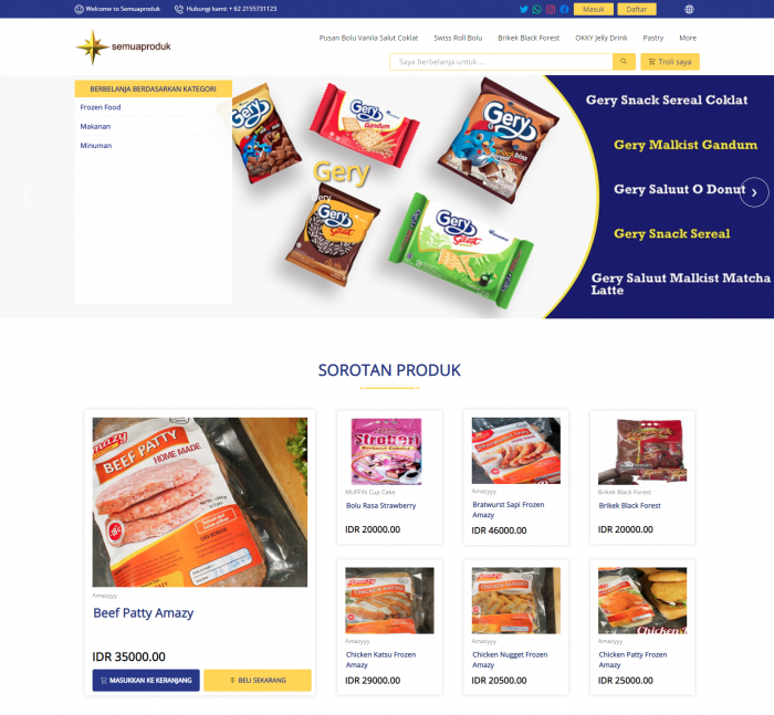Semua produk adalah website yang menjual berbagai frozen food, makanan, dan minuman. Website ini dilengkapi dengan fitur sign in dan sign up untuk pembeli. Semua produk seperti toko online untuk frozen food, makanan, dan minuman. Banyak frozen food dan makanan manis lezat yang dipajang di beranda website. Sosial media yang dipajang di website semuaproduk.com diantaranya Twitter, Instagram, dan Facebook. Semua produk juga memiliki whatsapp yang bisa dihubungi.