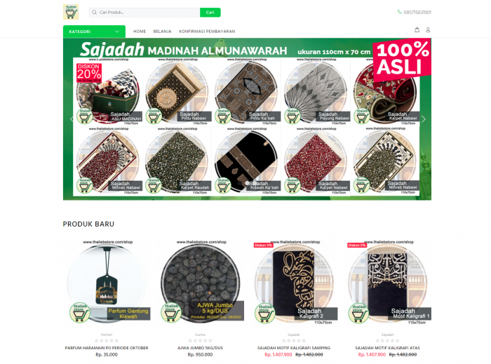 Website thaliebstore merupakan website yang menawarkan produk asli dari Makkah, Madinah, dan Cairo. Website ini memiliki fitur Sign In dan Sign Up untuk konsumen. Fitur – fiturnya juga lengkap dengan fitur Check up dan konfirmasi pembayaran. Ada kurma, parfum, sajadah, dan barang – barang asli dari Mekkah, Madinah, dan Cairo lainnya. Website ini memiliki warna tema hijau dan putih. Selain itu terdapat chatbot yang akan melayani konsumen juga whatsapp. Sosial media yang dipajang di website thaliebstore.com adalah Facebook dan Instagram.